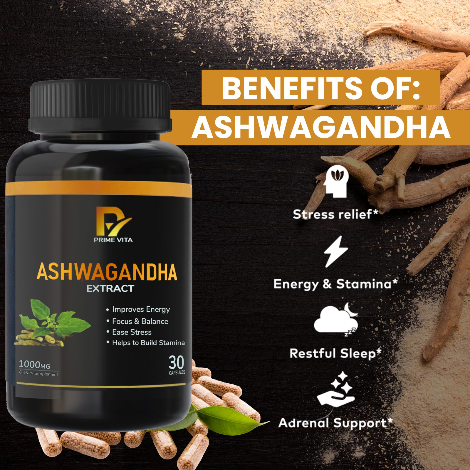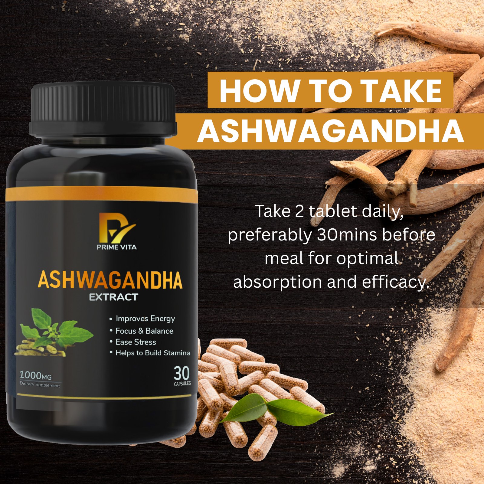 Discover the power of Ashwagandha, a revered adaptogen known for its ability to ease stress, enhance stamina, and improve overall vitality. Primevita brings you a potent 1000mg dose of premium-quality Ashwagandha extract in convenient, easy-to-swallow capsules.
